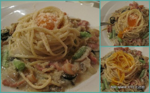 卡波那拿( 就是奶油培根蛋義大利麵) , 料很多 ..蛋黃拌開的那一剎那真迷人