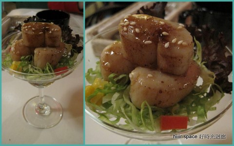 北海道帆立貝柱沙拉 , 香煎干貝很嫩很香甜, 好好吃唷--推荐 !!!